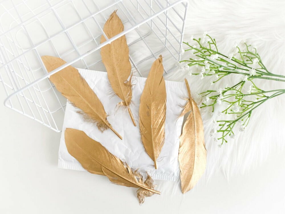 Dit soort decoratie materiaal vind ik erg leuk voor blog foto’s. Ze zijn niet te groot en daardoor erg handig. Deze veertjes zijn goud gespoten wat ze nóg leuker maakt. Jullie zullen deze veertjes vast en zeker terug zien op mijn foto’s.