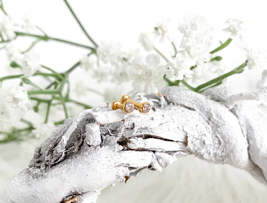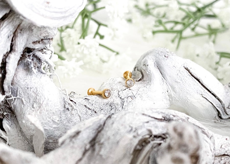 In totaal heb ik 5 piercings besteld. Laat ik beginnen met de simpelste piercings en dat zijn 2 dezelfde piercings in een andere maat. Deze piercings hebben een top met Swarovski zirconia en een labret staafje als achterkantje. Dit soort piercings draag ik zelf altijd graag als forward helix piercings en tragus piercing. Ik vind deze piercings rust uitstralen en dat kan ik wel gebruiken in mijn oren. Ik heb namelijk in ieder oor 3 oorbellen en 2 piercings. De topjes van deze piercings zijn hetzelfde alleen de labret staaf achterkantjes niet. Het labret staafje voor mijn forward helix piercing is namelijk 6 mm en het labret staafje voor mijn tragus piercing 7 mm. Ik droeg deze piercings eerst in het zilver en nu dus in het goud en ik ben er heel tevreden over. De Swarovski zirconia glimt zo mooi! Het topje van deze piercings kost € 15 en het labret staafje kost € 10.